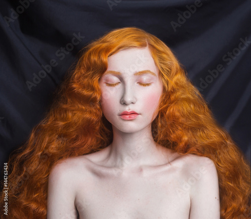 Woman With Long Curly Red Flowing Hair On A Black Background